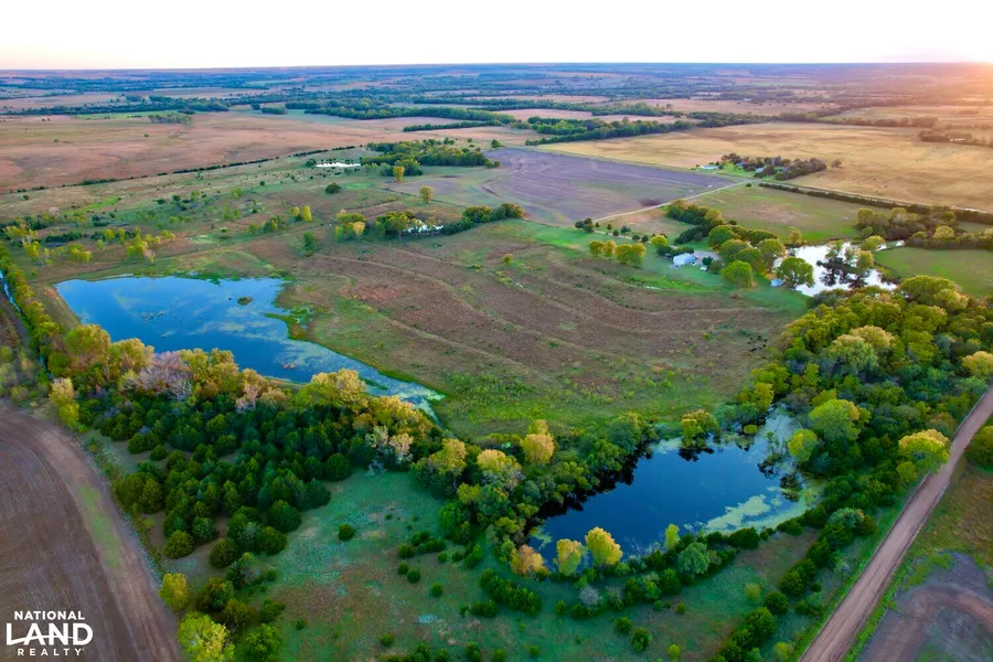 Spanning 151 acres, this property offers outdoor adventure and comfortable living. The 4 bedroom, 2 bathroom home provides 2000 sq ft of space. The open concept main level has 3 bedrooms, including a huge master, double sided fireplace, and incredible views. The basement consists of a secondary living room and bedroom. Everything is clean, updated, and move-in ready. You will love the covered porch overlooking the 3 acre pond - complete with two docks, diving board, and private beach. Located 20 miles southeast of Quivira Wildlife Refuge and 40 miles from Cheyenne Bottoms, the 7 +/- acre marsh is in the flight path for excellent duck and goose hunting. Four and five pound bass are commonplace in both the 3 acre and the 2 acre ponds. Two elevated shooting houses provide the ideal vantage points to catch whitetail deer cruising these fields. Remove the cattle and the native grass will flou...