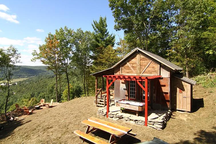 Cabin features: Built from recycled barn material that was taken off the property. 24 x 20 cabin including front porch, constructed with post and beam lumber (from the barn), outside kitchen, inside convertable loft overlooking the stars, woodstove, bunkroom, large dining area with lights powered by solar panels on the roof. There is a bump out on the back of the cabin for the outhouse. Very comfortable for the family! You have to see the view from the fire pit in front of the camp there are no words to describe it!