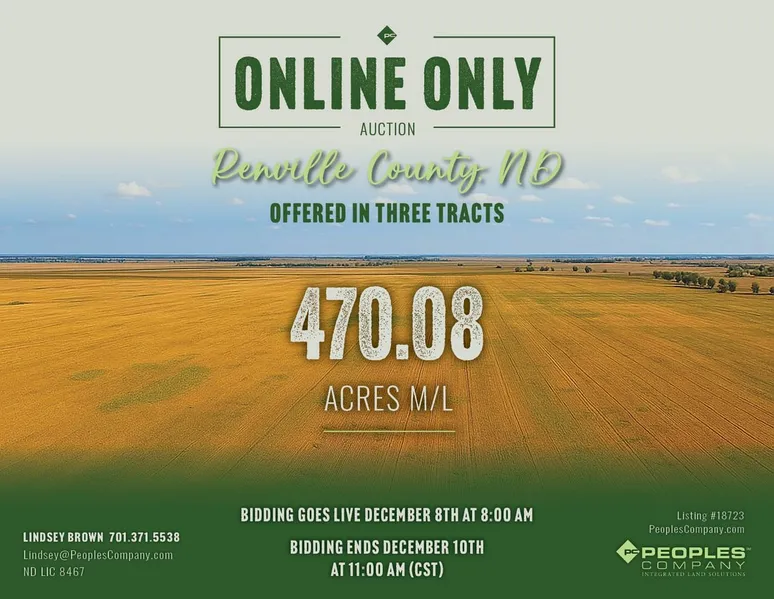 The auction will be conducted on the Peoples Company Bid Wrangler auction platform. The bidding will open on Monday, December 8th, 2025, at 8:00 AM (CST) and will conclude on Wednesday, December 10th, 2025, at 11:00 AM (CST). Any bid placed in the final three minutes of the auction will extend bidding for an additional three minutes on ALL TRACTS. The farm will be sold on a price-per-acre basis. Take advantage of this opportunity to own a piece of prime Renville County, North Dakota farmland.