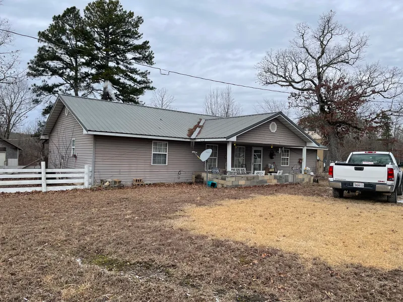 Large home all on one level built in 2007. Split bedroom floor plan. Large primary bedroom, primary bathroom and big walk-in closet on one end and two bedrooms and full bath on the other end. Living room, kitchen and dining area all one room and open with tongue & groom vaulted ceilings. Oak cabinetry in the kitchen. Laundry/utility room with a laundry sink, storage and a walk door to outside. Covered front porch, covered back deck and small covered stoup on the end. 30X50X16 metal workshop with 12x12 door, concrete floor and 110/220 electric. Two additional storage buildings and a detached carport. Wooded acreage on both sides of the county road. Nice size pond. Located on a dead-end road. Property is being sold As-Is as seller will make little to no repairs. 5 acres will be deeded off at closing. Not far from Current River, Clearwater Lake and Echo Bluffs.