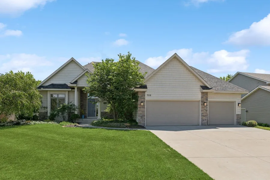 A glistening pond, sparkling stars, a contemporary home. Welcome to a stunning four bedroom, three bath walkout rambler with an office, main floor laundry, and spacious deck, seamlessly melding indoor-outdoor living. Admire the open floor plan with tall windows bringing in the mesmerizing, picturesque views to fill the interior spaces with natural light. Appreciate the bright kitchen with a butcher block island, quartz counters, a herring bone tile backsplash, custom cabinets with soft close drawers, gas range, and stainless steel appliances, the primary bedroom suite with an entrance to the 12x27 deck, the oak flooring, panel doors, high ceilings, transom and box windows, recessed lights, pocket doors, ceiling fan, established landscaping, an attached three car garage, new shingles (2022), and lots of storage options. Enjoy strolls on the meandering paths along ponds and parkland and va...