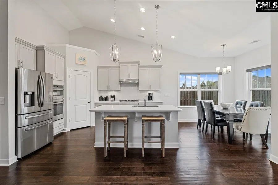 COOL MODERN VIBE + MAIN LEVEL LIVING 408 Orchard Grove Lane is a charming 3 bedroom/2 bathroom generously portion home with 2,204 sq. ft. This home just might be the home of your dreams. The entryway extends hospitality with its warm chocolate hardwood floors that grace the main living areas and compliments the soft grey wall palette that runs throughout the home. Southern traditional entertaining space connects to a bright & sunny eat-in-kitchen with stainless-steel appliances, invoking endless entertainment opportunities. The vaulted great room brims with abundance of natural light projecting a sense of calm & peace while turning the main living room area into a single unified space. Great room glass door leads out to a durable concrete patio that anchors .22 acres of fenced yard that is a blank canvas ready to become your own personal retreat. Secluded owner's suite features a 5-piece...