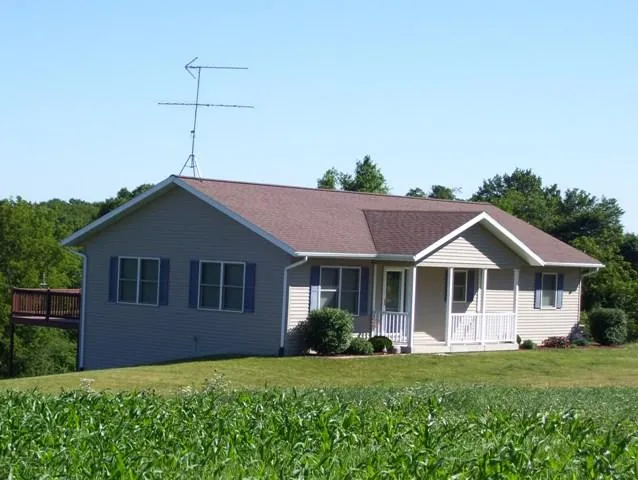 This custom built home offers: 3 bedrooms, 2 baths ,hardwood floors, vaulted ceilings, Amish cabinetry, dining room and spacious living room. Master bedroom w/bath, full walkout basement, deck, patio and covered front porch. 14 acres tillable w/income ,45 acres in woods featuring hidden valleys, springs, stream, and teaming with native wildlife. Kickapoo School district.