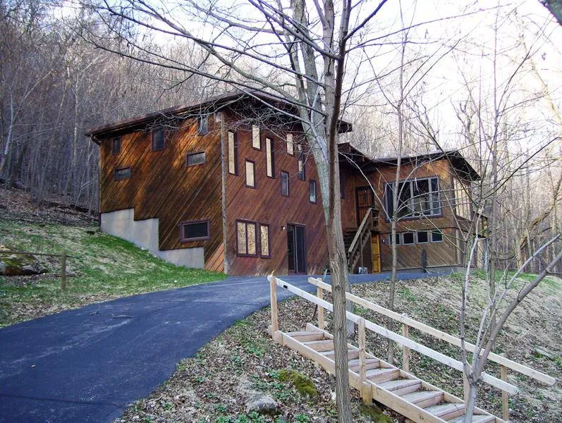 Unique blend of wooded ridges, valleys teaming with deer, turkey ,soaring Eagles, towering rock outcroppings, springs and nature trails. Rustic two story home features 2,168 square feet of living, two bedroom, 2 baths gourmet kitchen , open living room and sun room, lower level rec room and more. Three car garage with loft living quarters .