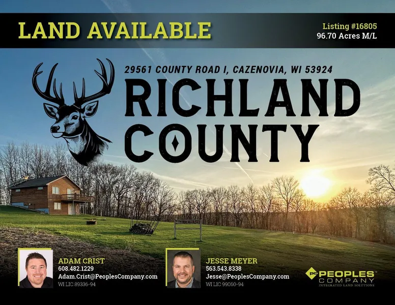 Peoples Company is pleased to present this exceptional opportunity to purchase a secluded piece of paradise on the ridgetops of Richland County, Wisconsin! This 96.7 acre, one-of-a-kind property has everything you could ever want to enjoy a private family or friend weekend getaway, yet also provides income-producing farmland to justify it!