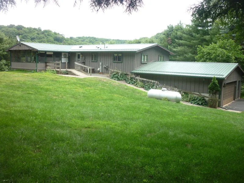 R-7499 Private and Secluded: 4 bedroom, 2 bath country home featuring 14.7 wooded acres, 22x24 attached workshop plus 30x30 garage. Features lower level family room, attractive kitchen with oak cabinets and island, 3 season porch, main floor laundry, newer metal roof, heating system and water heater. Lots of open area for the gardener in the family, ramped entrance with brick pavers. Great deer and turkey hunting in your back yard