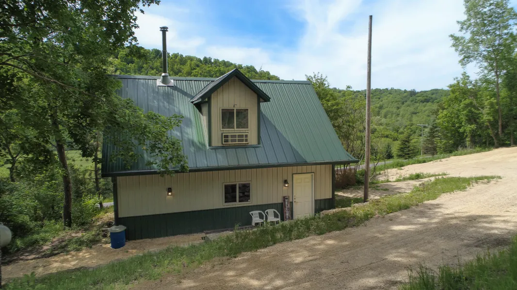 Youll notice a unique dual vaulted dormer build with vintage corrugated accents walls. The upstairs loft is roomy enough for head-room to walk freely without having to crouch. Windows provide a remarkable sightline to miles of endless bluffs and the winding creek teeming with trout! Theres been a tremendous amount of thought and strategy within this build to make it as maintenance-free and energy-efficient as possible. The shed ceiling is insulated with R-25 insulation and covered with white corrugated metal for a flawless look.