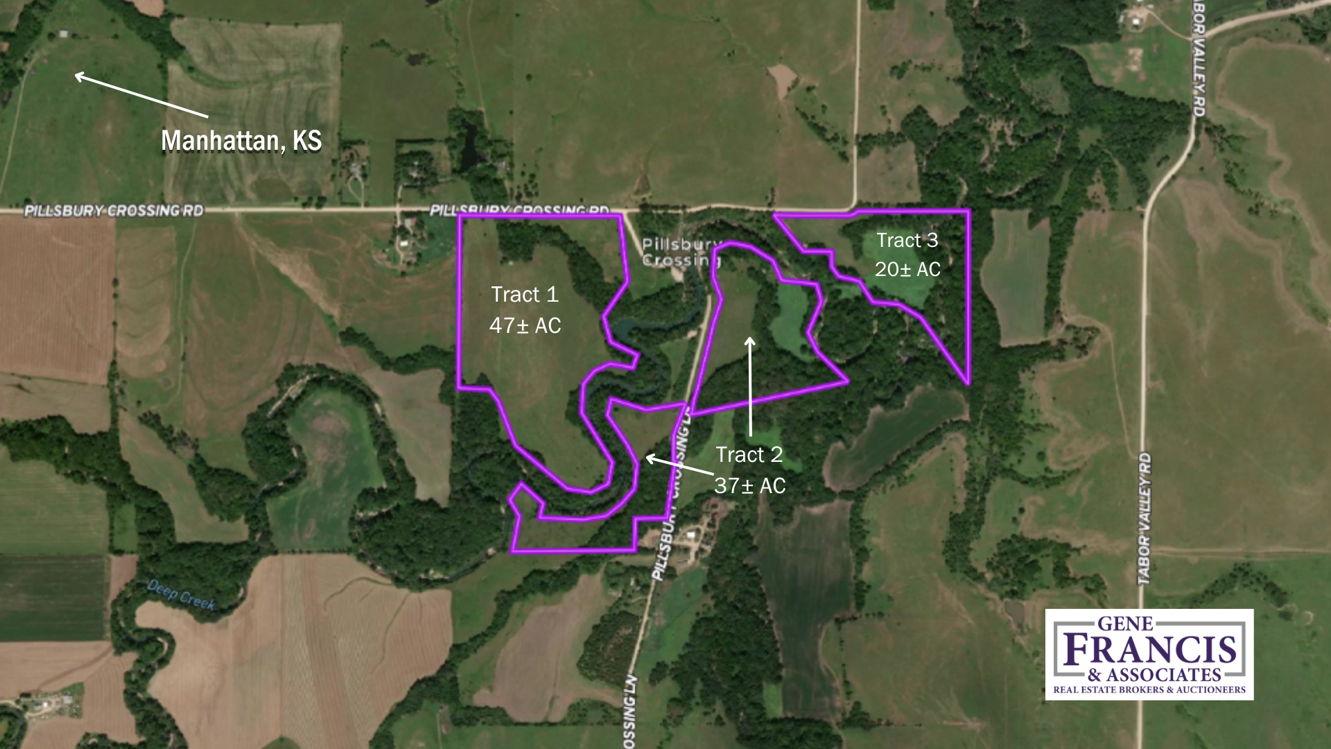 Research Parcel InformationFrom Manhattan, KS, travel 2 miles south on Hwy 177 to Deep Creek Rd. Turn east and travel 5 miles to Pillsbury Crossing Rd. Take Pillsbury Crossing Rd for 2 miles to the three parcels.