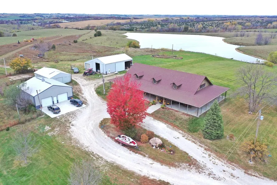 You'll love this southern-styled country home nestled in the peaceful rural setting of Ringgold County, located close to the border in southern Iowa. Come take a look at the open kitchen plan and the breathtaking views from the wrap-around porch. Catch a glimpse of the deer and wildlife that come close to the porch or catch some big fish from the lake while boating. This 5,700square foot, 4-bedroom, 3-bathroom home sits on 9.89 acres with an additional 31-acre m/l farm included with a 15-acre m/l lake stocked with bass, crappie, bluegill and channel catfish. This is a solid home that was well built! All walls are built with Insulated Concrete Forms, and the walls are 1' wide.