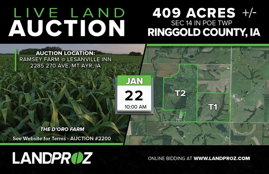 251 acres +/- in part of SW and NW of Section 14 in Poe TWP in Ringgold County, IA. There are, according to FSA, 191.68 +/- tillable acres with a CSR2 is 31.8