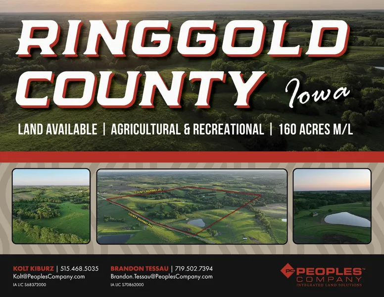 Peoples Company proudly presents premier pastureland with exceptional amenities in Ringgold County, Iowa. This 160-acre m/l property offers multiple opportunities for agricultural & recreational pursuits alike. With fertile pasture bordered by tight, well-maintained fences, this land provides your livestock peace of mind and security. This pasture has been well cared for and will be ready for your livestock operation from day one. Thanks to the paved highways, accessibility is a breeze, ensuring easy transport & convenient entry.