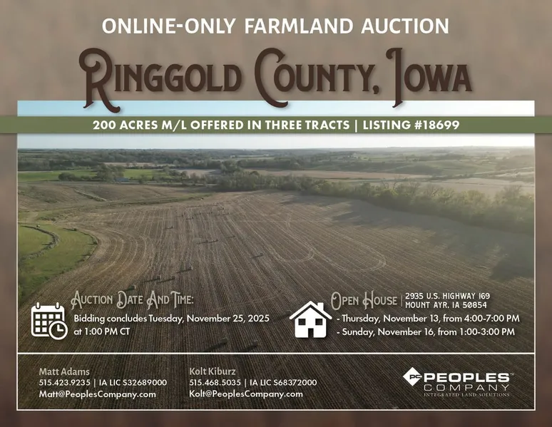 Ringgold County, Iowa Online-Only Land Auction! Peoples Company is pleased to be representing the Elliott Family Trust in the sale of 200 acres m/l located just east of Redding, Iowa. The portfolio consists of three tracts situated in Section 9 of Middle Fork Township, Ringgold County, Iowa. The tracts will be sold via an online-only auction with bidding concluding at 1:00 PM CST on Tuesday, November 25th, 2025.