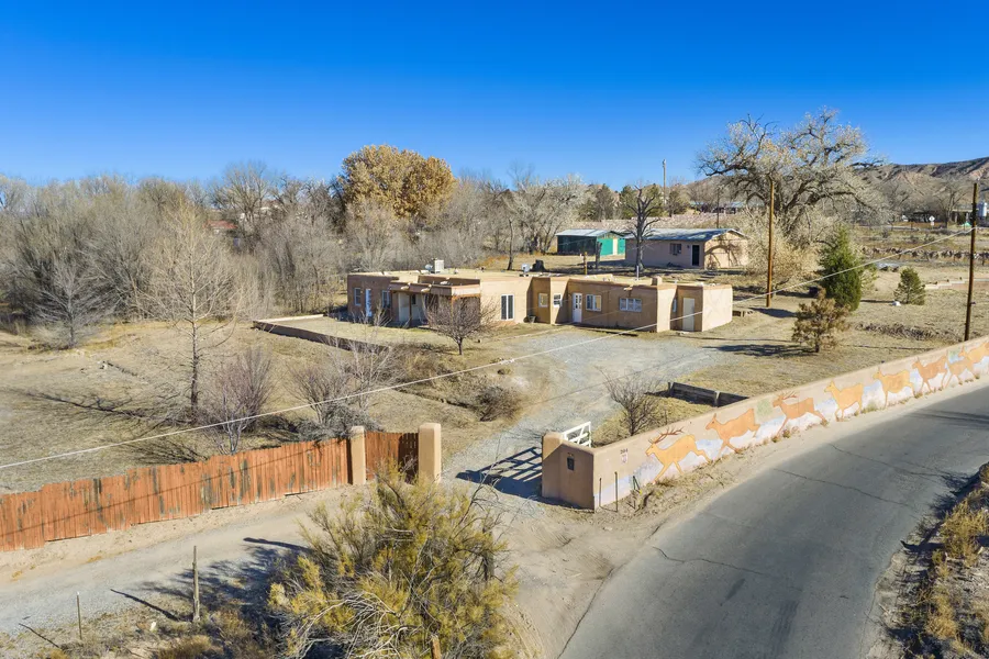This west-facing classic adobe home with oak floors and beamed ceilings is perched on 2.4 lush acres with Cottonwood trees, fruit trees and an acequia running through accompanied by water rights. Gaze at the snow covered Jemez in Winter, enjoy the mature landscape in Summer and drink in the breathtaking sunsets all year long. This estate, entirely fenced and partially enclosed with a stucco wall and over 2 acres of uninhabited tribal land between you and the closest neighbors leaves you feeling like you have your own private chunk of space. New butcher block counters, newer appliances, newer septic and private well, freshly painted with well maintained roof and recently repaired stucco makes this home ready for you! Large detached garage fully finished with lighting and wood burning stove would make an excellent studio. Just minutes from 285 allowing convenient access to Santa Fe and Los Alamos. Schedule your showing!
