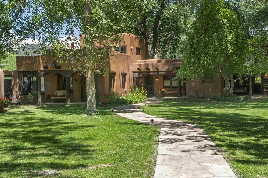 Nestled along the banks of the Rio Grande under ancient trees, with a private beach and wonderful water access; this secluded river paradise is a private oasis from the world. Consisting of a main home designed by Greg Allegretti, an attached old log cabin and a separate studio/office which is ready with plans for a bedroom and bath addition so as to have a detached casita. The main home has an open feel with the living/dining enjoying an incredible river rock kiva fireplace, vigas and beams and French doors opening to the patio and enormous lawn and river vista. The primary bedroom also has a sweet kiva, dressing room and a magical screened sleeping porch for summer sleeps lulled by the rushing river and owls hoots. A loft provides a super office space or guest area. The cool, campy kitchen opens to the main living spaces and also leads into the old log home which also enjoys a wonderfu...