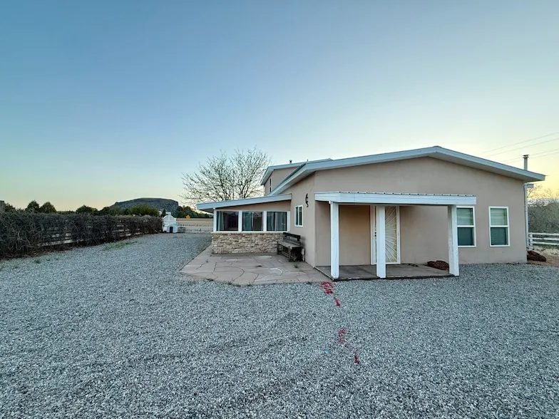 Tucked away at the peaceful southside of La Mesilla, this beautifully positioned property borders the tranquil Santa Clara tribes Bosque. The home features a spacious 3-bedroom, 2-bathroom design set on a full acre of land, complete with a barn with individual side access. The barn, situated at the edge of the bosque, features two horse stalls, divided pens, and three designated storage areas.The upstairs primary bedroom includes an ensuite bathroom and a private porch, perfectly placed to capture breathtaking views of Black Mesa and the surrounding bosque. The open living area is highlighted by a high-pitched ceiling, creating an inviting and airy space ideal for gatherings or quiet relaxation. For those seeking a private retreat in a serene setting bordered by mature trees, this property is a rare find you have been needing.