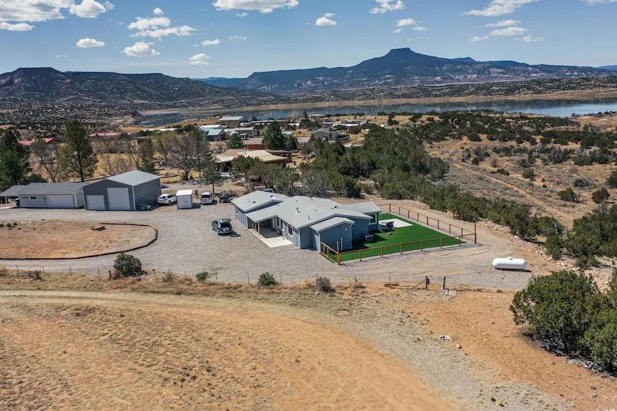 Imagine living and raising your family on Abiquiu Lake. The gated Subdivision renders easy access off HWY 84 on a paved road, and a generously graveled subdivision road. Never have to worry about access to the lake or your home. This home, that was once a part of a family compound, has all the bells and whistles one would want in a home. An incredible open concept chef's kitchen, with spectacular appliances. Granite countertops and lighting add to the luxury. The owner suite is private and sensational, one would have to see it for oneself. Included in this suite is a home office space but could easily be converted into a personal place to read, write, sing, or watch television.