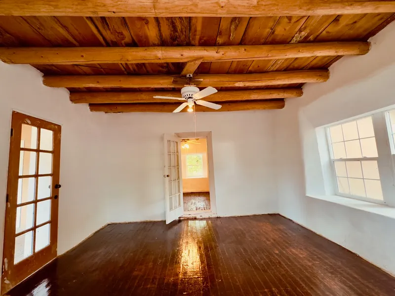 Historical, intriguing and magical. This unearthed treasure in Chimayo. Imagine families pouring dirt and water into small wood frames to create an adobe (mud block). Mixing in straw to the mud of the adobe blocks to create strong durable walls. A century ago, the families would build with double adobe walls, creating a stronghold for their families. Adobe block. No chemicals. Only the earth’s ingredients itself. Next, as many families in this small community would do, they would either go to the nearby Carson National Forest and collect the lumber that would be cut into flooring or placed above ceilings in rafters known as vigas. A horse ride to nearby Santa Fe to collect glass for doors and windows and steel roofing. Now, a home build not to last one century, but many centuries! So solid inside the home, you would feel like you're in paradise. This adobe home, built in the 1900's by the local Trujillo family, well-known weavers and carvers. A local man named Cordova, came in, saw its potential and slowly and meticulously brought it back to life. Step by step. Placing a true value on a home like this is immeasurable. It is a timeless treasure blending historical charm. With daily improvements and renovations, 2,300 sq ft haven features 3 bedrooms, 1 bath, 2 living areas, and a studio. A rare chance to own a piece of New Mexico's rich heritage. Step inside to discover traditional Vigas—wood beams harvested from the nearby Carson National Forest—gracefully curved adobe walls, and natural wood floors that echo the region's storied past. A charming portal and quaint courtyard invite you to savor outdoor living. Handcrafted wooden doors and a custom gate by "Las Puertas de Santa Fe," adorned with intricate iron details, and a durable tin roof add to the home's rustic allure. The courtyard is modeled after the Santuario De Chimayo Church. Almost completed and only needing kitchen cabinets. Daily work continues. It's almost like unearthing a historic treasure.
