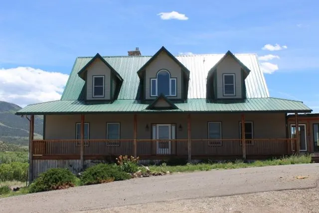 "QUEEN OF THE HILL HOME AT 8,300 ELEVATION ON 14 ACRES WITH NO COVENANTS." This beautiful custom home was built in 2003 and is located approximately 5.8 miles from the town of Del Norte on desirable Pinos Creek Road off of Hwy 160. Covered porches on North and south facing side of home capture magnificent 360 degree mountain and valley views. Interior of two story home has stunning views from all the windows, T&G ceilings, hardwood floors, beautiful natural gas fireplace with river rock hearth, nice windowed dining area, spacious kitchen with island and lots of cabinetry. Master suite is on the main floor and has a lovely bathroom with an oversize tub and picturesque mountain view from large window. Office den area adjacent to master bedroom with amazing views. Upstairs has quaint seating/loft area overlooking living area, two bedrooms and full bathroom. Enclosed breezeway with exterior ...