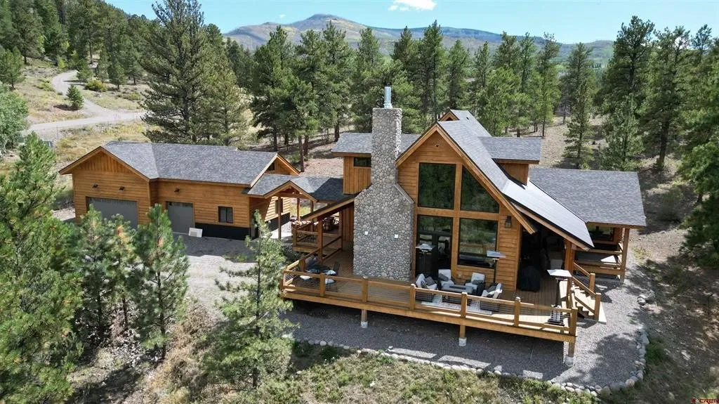 Lori Johnson, Steffens and Company Realty, Inc, C: 913-488-8009, , Your Colorado dream home awaits in the heart of the breathtaking San Juan Mountains. This stunning 2,429 sq. ft. home on 2.5 acres offers both luxury and comfort, with a heated three-car garage, bonus room for fitness or game days, and stairs leading to a full attic for extra storage. Step through the breezeway to the main entrance, surrounded by a 1,200 sq. ft. wraparound deck with unforgettable mountain views. The covered side decks are finished in beetle-kill pine, and a private nook features a built-in saltwater hot tub—perfect for soaking as deer wander by. The exterior is finished in rustic rough-sawn pine for timeless Colorado charm. Inside, the open-concept design blends kitchen, dining, and living spaces seamlessly. Custom Knotty Walnut cabinetry flows through the kitchen, mudroom, laundry, and baths, paired wit...