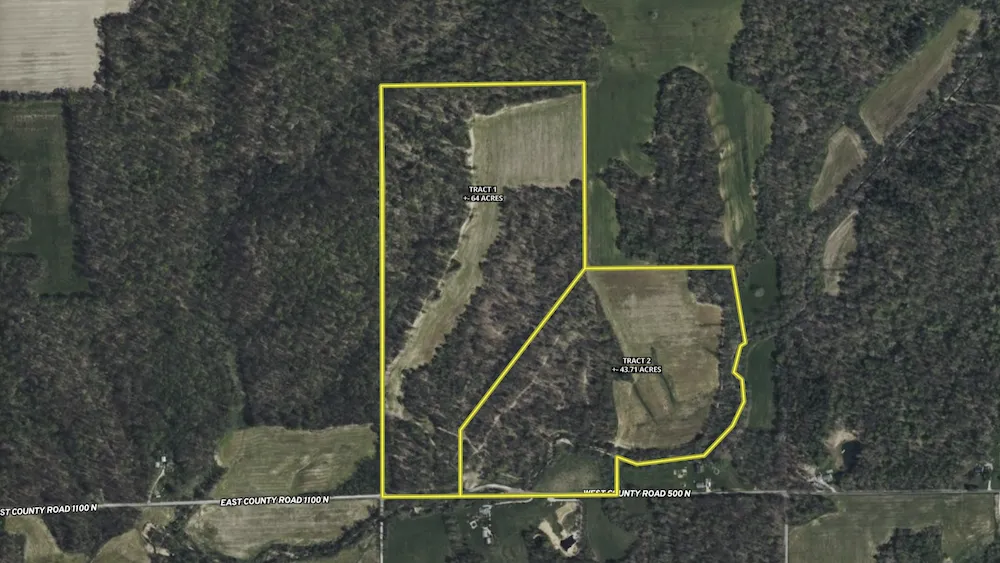 Tract 1 of 2: This +- 64-acre rural tract near Osgood, Indiana, offers a balanced mix of approximately 18 acres of dormant tillable landleft uncultivated for two yearsand roughly 46 acres of lightly harvested hardwood forest. The tillable soils consist primarily of silt loams with favorable productivity ratings. Road access is straightforward from County Road 500 North, where the property includes about 500 feet of frontage. Electric and water infrastructure are accessible along the roadside. A recent survey (December 2024) clearly defines the overall acreage and exterior boundaries (not reflecting the parcel split). The tract extends roughly 2,700 feet back from the road, yielding a long, private parcel layout. At the rear, a field opens up with minimal visibility from the roadside and very few surrounding homes in sight. The terrain includes a diverse mix of open field, forested edges,...