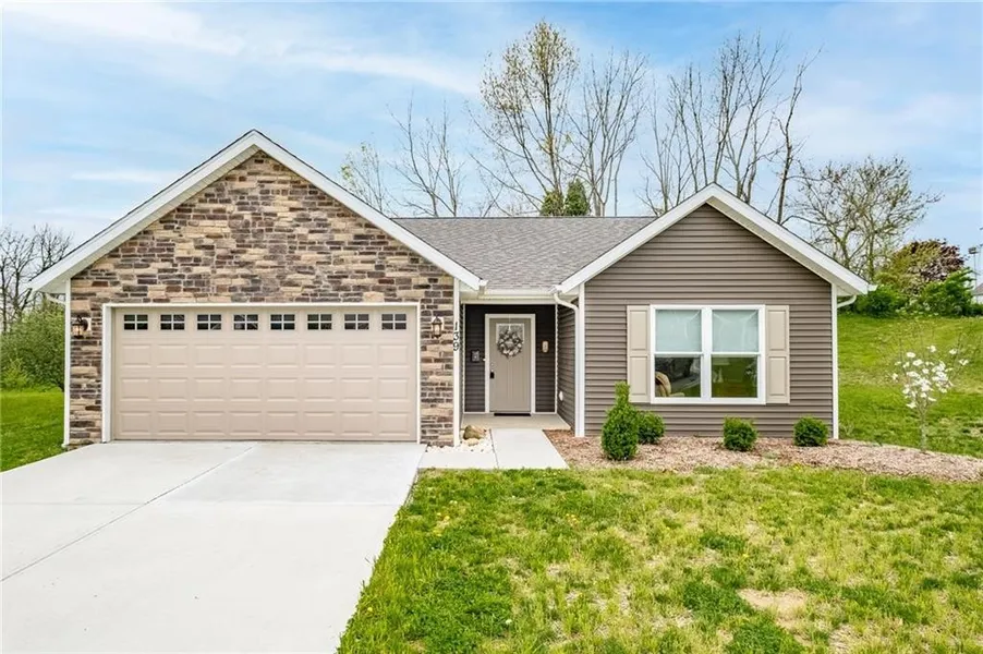 This 1-year new split ranch w/zero entry offers over 1300 sq ft. It's a must-see offering 3 bedrms & 2 full baths. Upgrades thru out include Kitchen w/ LVP flring, wood cabinets w/pull outs, subway tile bck splsh, undermount lighting, lrg pantry, SS applnces, counter bar open to living rm w/vaulted clngs, ceiling fan, upgraded padding & carpet, 5" BB & craftsman style interior doors thru out. Primary bdrm offers natural light, clng fan, lrg walk in closet w/adjoining bath including vanity+tower cabinet & shower. 2 bdrms & a full bath just off foyer offer walk-in closets & plush carpet. Don't miss private back yard & patio to watch birds & nature. Laundry room w/washer & dryer & pantry, two car garage.