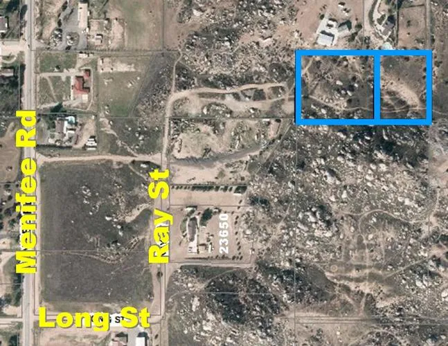 Driving Directions: From I-215, take exit 17 Hwy 74. Take San Jacinto east. Turn right/south on Menifee Rd. Turn left on Long St and left on Ray St. Pass the house on the right at 23650. Turn right. Note that parcels are landlocked with no legal access and no easement. The parcels are south of, and adjacent to, the houses at 29225, 29295 and 29375 Nuevo Valley Rd. Take an aerial map. Don' t leave home without the aerial map.