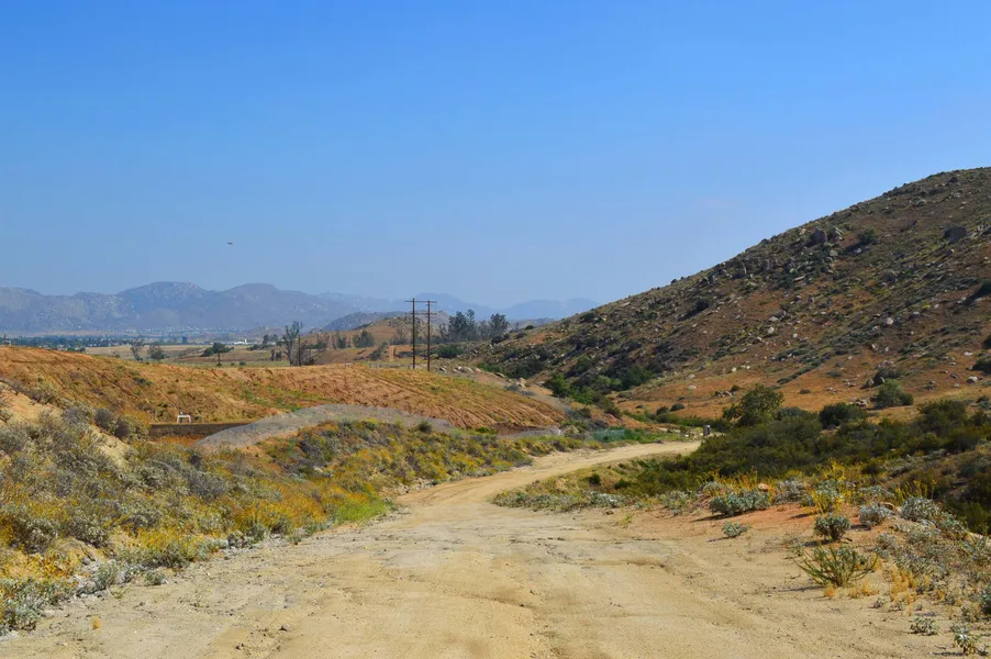 Driving Directions: From I-60, drive north on Reche Canyon Rd. Pass the homes at 10910 and 10950 Reche Canyon Rd. Enter where you see the sign that says Not a through street 27050. After entering this unlocked entrance you will go 2 blocks and reach a locked gate. Do not enter the gate. Halfway between the unlocked entrance and the locked gate you passed a dirt trail going uphill on the right. That trail is unsigned Vista Suelto Rd. Vista Suelto offers access to the southern portion of the parcel for sale. It is marked with a yellow arrow in the aerial map. Park and walk up the trail. Take the aerial map with you.