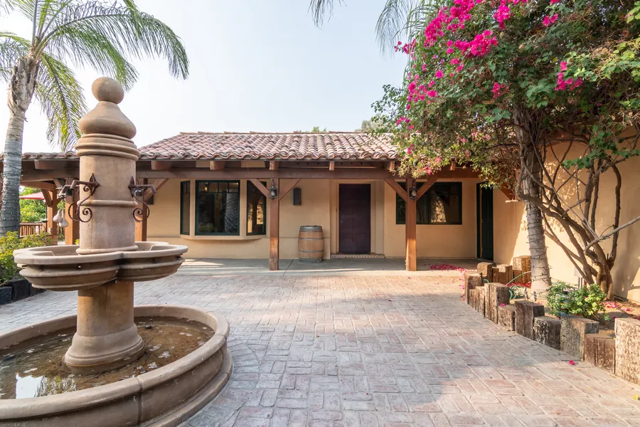 Your spanish Hacienda awaits! Enter this secluded sanctuary via a gated private driveway. Situated on 1 acre-plus, all fenced and secure. This amazing property entices you to the beautiful sweeping Veranda with a spanish fountain and views of citrus trees and city lights beyond. A swimming Pool and lighted Volleyball Court provide hours of enjoyment! Just imagine the entertaining you could do here! The home is inviting with vaulted ceilings and spanish tile flooring, rustic touches in the hardware and fixtures all throughout, in fact many of the artisanal accents in the lighting and fixtures were searched for or custom made especially for this home. The kitchen offers corian counters and bar with built in appliances and opens to the dining and living areas. 4 bedrooms including 2 Master Suites! Featuring cedar lined walk-in closets and one with a Fireplace. Both have beautiful baths with...