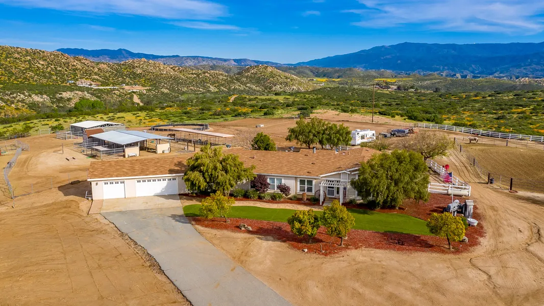 Property features 3 bedroom with master retreat, 2 bath with double sinks and 3 car garage on 4.7 acres in the valley where wine country meets Sage. Views of Mt Palomar Observatory. Entire property fenced and cross-fenced with no climb and white ranch fencing. Very bright open floor plan. Arena, round pen and various turn out areas. 5 stall mare motel with welded wire panels plus 2nd enclosed metal barn with 4 addl stalls and tractor utv storage. Chicken coop and small animal pens. Saltwater pebble tech pool spa with gas fire pit. Artificial lawn, well water and SOLAR- low to no utility costs. Tuff shed tack room with shop bench and loft. Soft water system. Several fruit trees and garden area. Over-sized master bath walk in shower and sauna with his/hers sinks. Automatic front gate and several gates along property line. Miles of trails right out the gate. If privacy is what you are looking for, this is the one for you.