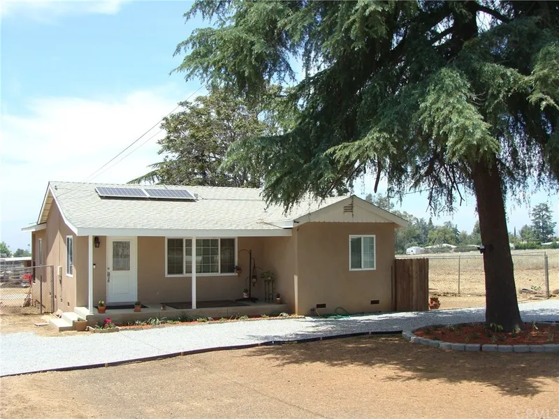 This is a very cute single story SOLAR home on HORSE PROPERTY. Approximately 489 permitted Square Feet was added to the home in December of 2016. This home offers 3 bedrooms, 2 updated bathrooms, large family room, spacious updated kitchen with lots of cabinet space, separate dining room, indoor laundry room, tile and hardwood floors, lots of storage space, front and back porch, new stucco and paint on the outside, new roof, new HVAC system, new 200 amp electric panel, tankless water heater and yard is completely fenced in and also offers cross fencing. There is a 16 x 20 garage with a storage room attached to one side of the garage, covered hay storage, one covered horse shelter that is cemented in is included, separate RV parking on the North Side of the house is fenced in and has a dump station along with 220 hook up. Home is situated on 1.25 acres of flat usable land and is close to ...