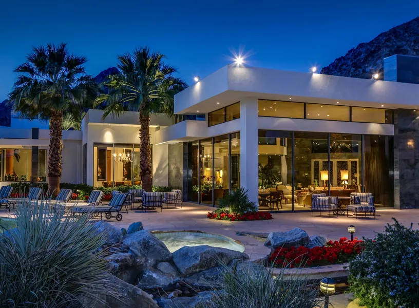 Built by internationally renowned architect Guy Dreier, whose designs define sculptural elegance. Quoting Robb Report: ''Dreier's homes are geometric feats of design and engineering with great consideration given to the native landscape''. This home offers sweeping views of mountains, fairways, and lakes from an elevated acre-plus homesite overlooking the 16th hole. Extraordinary and generous use of luxe materials provides a most sophisticated design that is incredibly functional and easy to live in. The open floor plan allows for elaborate entertaining. The intelligent separation of living spaces allows for three comfortable detached guest villas, all with separate access. Executive office on a separate level with private balcony. Even the walk to this office is extraordinary as the hallway flooring is intersected visually for a clear view to the stream and waterfall beneath. The primary bedroom retreat enjoys its own wing with an ultra bath. Generous room proportions throughout with a subdued color palette in earth tones. This home is offered designer furnished. The Quarry is the only golf course in the Valley rated in the top 100 in the US and the top 10 in California. Video and more photos available.