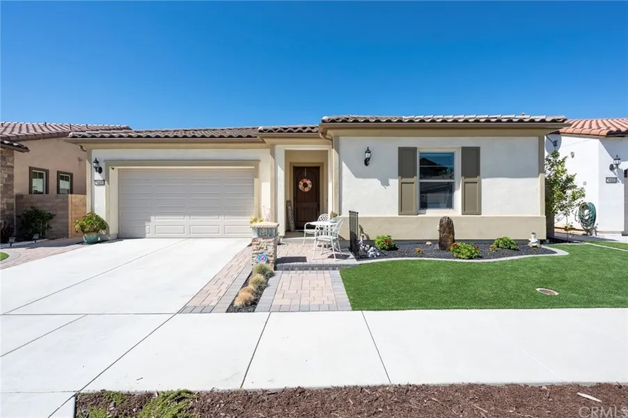 It starts behind the gates of this 55 plus resort style living, in Terramor. This beautiful three bedroom, two bath home welcomes you with a open floor plan with unobstructed mountain views. Amazing chef's kitchen has upgraded "moon white" granite countertops, stacked cabinets to the ceiling, farm house porcelain sink, walk in pantry, an abundance of storage and Kitchen Aid stainless steel appliances. Enjoy a see-through wet bar with a wine-beverage refrigerator and sink. Lovely gas fireplace with built-in glass shelves. Retreat to the master en suite with plenty of closet space, with upgraded quartz countertops, dual sinks and walk-in shower. Additional living space that can be tailored to your lifestyle. This home has a neutral palate of color, beautiful engineered wood flooring and recessed lighting. Enjoy your breathtaking view from the California room with a motorized screen or the above ground spa. Pet friendly yard, with artificial grass and garden boxes. Two car garage with 2- 220V 50 amp plugs for electric cars. Epoxy flooring with plenty of storage. Fully owned Tesla solar electric system with 18 panels. (5.67Kw system) Come and enjoy the amenities that include, indoor and outdoor pools, a spa, gym, sports courts, fire pit, two outdoor cooking areas, staffed bar and a community room to host your parties. Over 5 miles of walking trails. Join one of many clubs that include, a men's or women's club, gardening, cards and much much more.