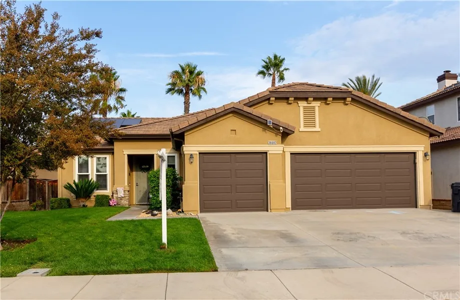 Here is your chance to own a delightful move in ready one level home in award winning Temecula School District! This home definitely illustrates pride of ownership. Welcome home to this quiet Winchester street, just a hop, skip, and a jump from French Valley Elementary school, and community park. This beautiful home has many upgrades including new living room LVP flooring, crown molding in most rooms, quartz kitchen countertops, and full tile backsplash in the kitchen. The architectural detail inside the home is sure to catch your eye with the captivating archways, open concept floor plan, and 9 foot ceilings. The natural light that flows through this home is sure to be a favorite. Imagine sipping your morning coffee on your large covered patio, in your generously sized backyard. Your family and friends will love the spacious backyard, which is currently landscaped with drought tolerant landscape. The size of the backyard will make creating a personal oasis of your very own a possibility- build a pool, plant fruit trees, and a vegetable garden, add a putting green, really the options are endless. Desirable location, not too far from freeway access, Temecula Wine Country, Lake Skinner, dining, and shopping, and plenty of outdoor recreational opportunities. NO HOA. Contact listing agent to view this amazing home. Buyer to assume solar loan.