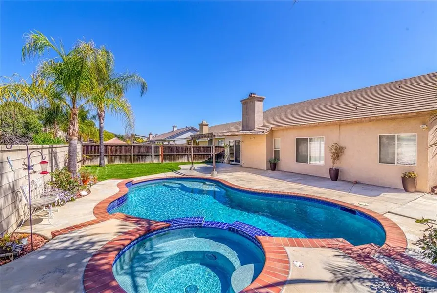 Single Story Gem! Beautiful 4 Bedroom, 2 Bath Pool Home in French Valley. This home offers a spacious floorplan, high ceilings, and plenty of room for entertaining. Upon entry you will find the formal living room and dining room. Off the living room is a large bedroom with double doors. The Kitchen opens up to the family room with fireplace and features a large center island. There are 3 additional rooms including the Primary Suite located down the hall. The Primary Bathroom has double sinks, separate shower and tub. Walk in Closet. Laundry Room located off the Garage. 2 Car Attached Garage. The backyard is a piece of paradise with lush landscaping, pool and spa. Low Taxes and Low HOA. Zoned for Award Winning Temecula Schools.
