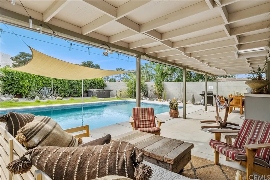 Presenting this charming 3 bedroom, 2 bath Palm Springs home featuring a resort style outdoor living area that is an entertainer's dream. The large backyard is complete with a beautiful sparkling pool. This contemporary home sits on the 15th hole of the Tahquitz Golf Course! The landscape can be opened up for golf course access and view. Imagine sitting in this backyard while watching the sunset over the San Jacinto mountains. The home features skylights to allow for lots of natural light. It has quartz countertops, stainless steel appliances, and updated bathrooms. You may exit the bedrooms via the large slider doors that will take you to the spectacular backyard which boosts a covered patio, multiple seating areas, spa, fire pit and beautiful large heated pool. This residence is designed and ready for immediate move in. It is perfect if your looking for extra income as the City of Palm...
