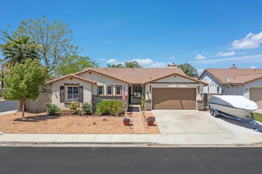 If you're looking for a single story Winchester home with no HOA, you've found it! Enjoy the privacy of being on a corner lot, or take advantage of the pool sized lot ready for you to put in your pool this summer. From your elegant front entry access all of the secondary bedrooms and bathroom, privately tucked away in their own front "wing". The owner's suite is set at the back of the home with its own back yard access and en suite with separate tub and shower, dual sink vanities and large walk in closet. From the center "hub" where you'll entertain in your formal living room and dining room, continue to approach your family room with beautiful stone detailed fireplace and open kitchen with island, granite counters, stainless steel appliances and ample cabinet and counter space. The whole house dual water softener and filtration system along with the reverse osmosis system is a wonderful benefit to healthy living and the 18 panel solar system is an added offering for savings and efficiency. Don't miss the three car garage with overhanging storage and enjoy walking to the park that's just down the street. This home has so much to offer and is just waiting for you to make it HOME.