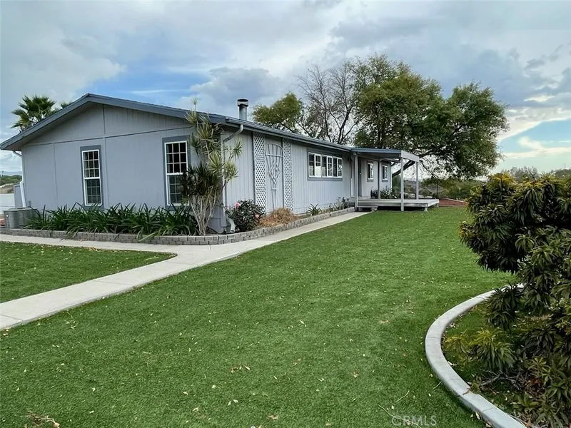 Temecula Wine Country View Home... Great location. This 4 BR 2 BA upgraded manufactured home sits high on 2.11 AC corner lot with paved roads. Gorgeous views, oversized 3 car detached garage, detached storage and RV parking with full hookups!!!! Adding a second dwelling is possible, or small vineyard, Just minutes from schools, shopping, hospitals, all wineries. This almost 1800 sq ft home is on a 433 approved & permitted permanent foundation, and has an open & spacious floor plan with wood burning Fireplace. This home also features newer laminate wood & tile flooring with carpet in bedrooms. Newly remodeled & freshly painted interior. (2022) Crown molding, Master bath has been updated and remodeled, Kitchen features breakfast bar, tile flooring. All windows have been replaced, newer HVAC (2017) A covered patio with stamped concrete & exterior entertainment island with frig, wired for an outdoor spa, front and side yard artificial turf. Enjoy hot air balloons at sunrise and awesome evening sunsets, country living at it's best. Close to Galway Downs EQ Center, entertainment & camping at Vail Lake. Low taxes, no HOA, property is AG rate approved, you won't be disappointed. This home is in turnkey condition.