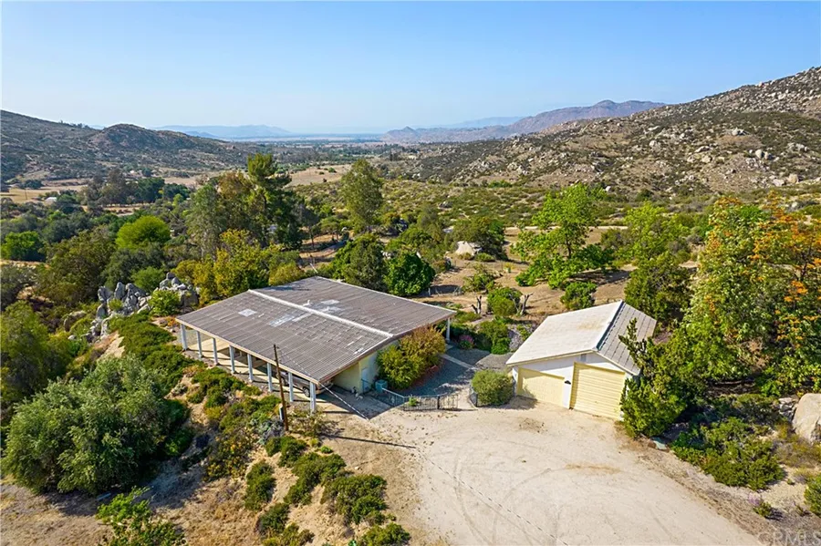 Manufactured home on 2.5 acres in a rural area ten minutes from Temecula wine country near Sage with a million dollar view of San Jacinto Valley and snow-capped mountains. It features a 1972 manufactured home, approximately 24' X 59' with 2 bedrooms and 2 baths and a huge living room. There are large awnings on both sides that provide a large patio and carport areas. The parcel also features a 31' deep 2 space RV garage with an RV garage door. There are fruit and nut trees with drip irrigation system fed by a shared10 gpm, 380' deep water well. The well produces great tasting water and is inexpensive to operate.