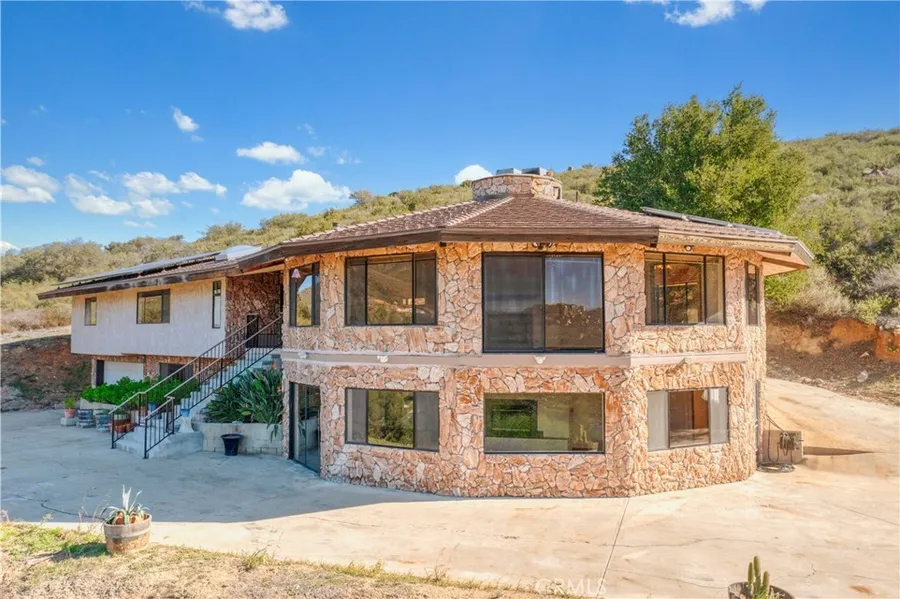 This, very private, custom home has 4,691 sq ft. set on 4.4 acres. With over 500 linear feet bordering the Cleveland National Forest in the charming El Cariso Village. With magnificent views of the surrounding mountains, the home has 4 bedrooms and 4.5 bathrooms with a library downstairs that could easily be converted into a fifth bedroom. The lower floor of the home includes a wine cellar, bedroom with private bath and walk in closet as well as two extra rooms that could be used for any hobby or design of your choice. The octagonal design of the house gives it a unique feel and panoramic views from both floors of the home. This property is located on the Ortega Highway, one of the only corridors for miles between Orange and Riverside Counties with easy access to both the 5 Freeway and the 15 Freeway. It is a horticulturist's dream with plenty of room for green houses, nursery, gardens, horses and more. The home has 2 large A/C units, both of which have been replaced in the last few years. 1000-amp power supply, all utilities underground, fire hydrant on property. Security motion sensor lights. All windows dual-pane and tinted. Walls downstairs are 12 inches and 8 inches thick upstairs. Roof is Alcoa aluminum country cedar shake with one inch non-flammable insulation. Hearthstone airtight wood burning stove in family room. 2-inch copper piping. The home is built to very high standards, solid oak cabinets, teak transitions, Kohler sinks and toilets. Solar power was installed in 2014 and is paid for. There is a 1300 sq ft metal workshop/storage building on the lower section of the property. The workshop is ideal for storage of boats, cars, toys or for use as a contractor workshop/staging area. The is plenty of room alongside the workshop for vehicles, RV, storage. With the forest less than 100 feet from the home, it's a short walk to this secluded plateau of nature that is near impossible to get to from anywhere else. the Cleveland National Forest with hiking and riding trails. This is a truly unique property and location.