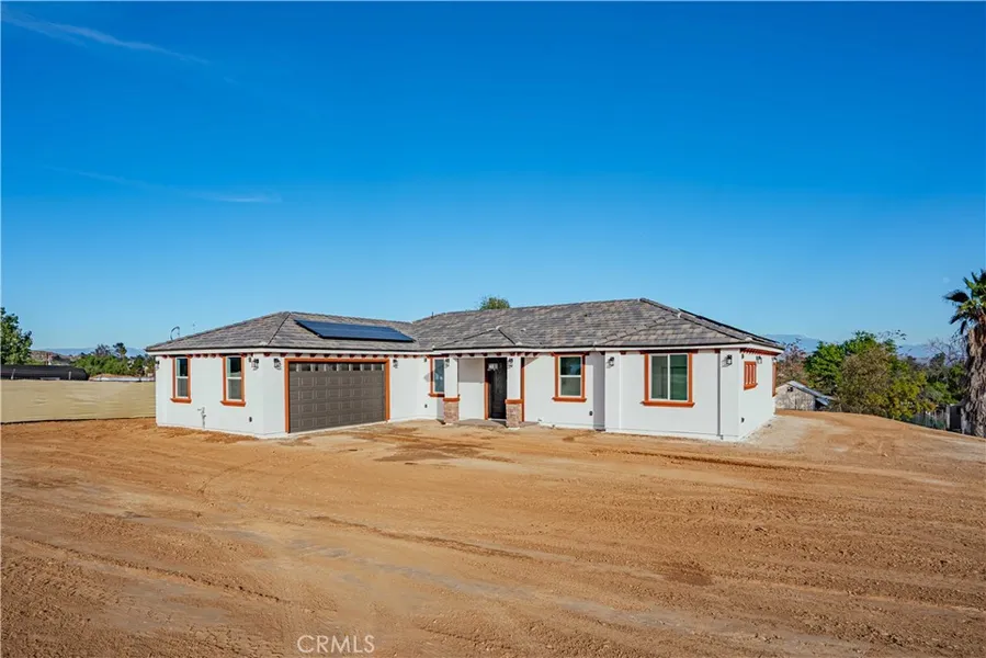 Welcome to this stunning new built ranch style home in the city of Perris, conveniently located, close to Hwy 74 with easy access to the 215 Fwy and 15 Fwy. The residence sits on just over a 1 acre lot with a private easement from the main road which offers privacy. This gorgeous home boasts an open floor plan with 4-Bedrooms and 2.5-Bathrooms and an attached two car garage with direct access to the kitchen. As you enter through the stunning rod iron front door you will walk into a large living room with plenty of natural light, to the right there is an impressive master suite, one bedroom, 1/2-bath, and a laundry room. To left there is an open kitchen with an island, and just next to it a hallway that leads to the second full bathroom with a bedroom on each side. Towards the back of the living room past the dining area there is a double sliding door that leads to a cover patio. The prop...