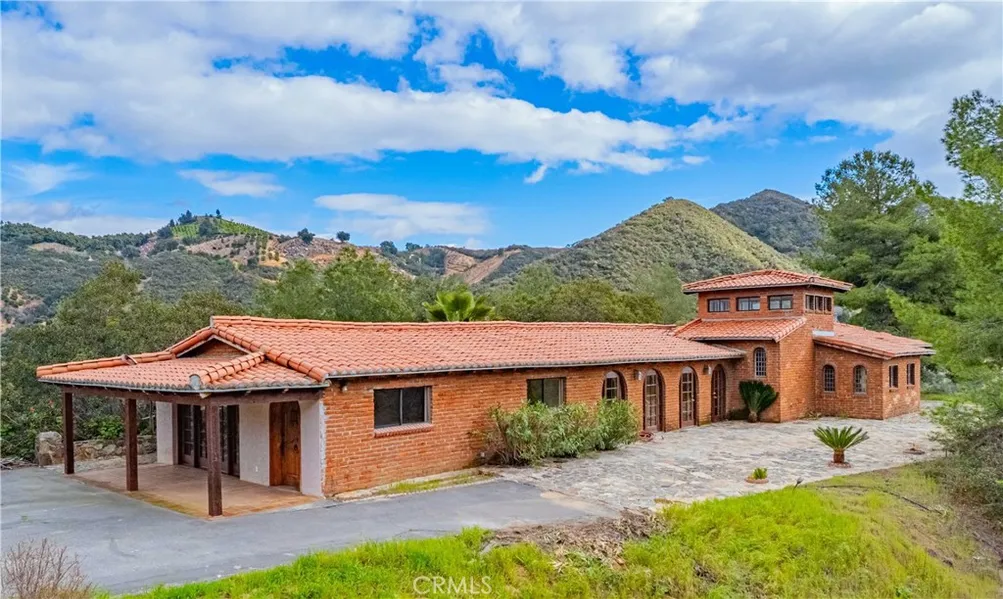 Welcome to a classic hacienda California acreage estate. This uniquely custom Spanish style home sits atop a ridge at the center of the property boasting 360 panoramic views. A tremendous opportunity to add value. The property is bordered by a seasonal stream to the west and a year-round flowing stream on the east. Beautiful for hiking and exploring. Or to simply relax and escape the summer heat in the shade of the oaks and listen to the sounds of the babbling creek. The slope from the house down to the main road is terraced with many exotic citrus and avocado trees with plenty of room to plant a grove, or vineyard or whatever you prefer. It also has an access road that circles the property making maintenance and access ability to all 10 acres much easier. The front of the property has a potential build site with water and power available for a potential workshop, garage, granny flat, et...
