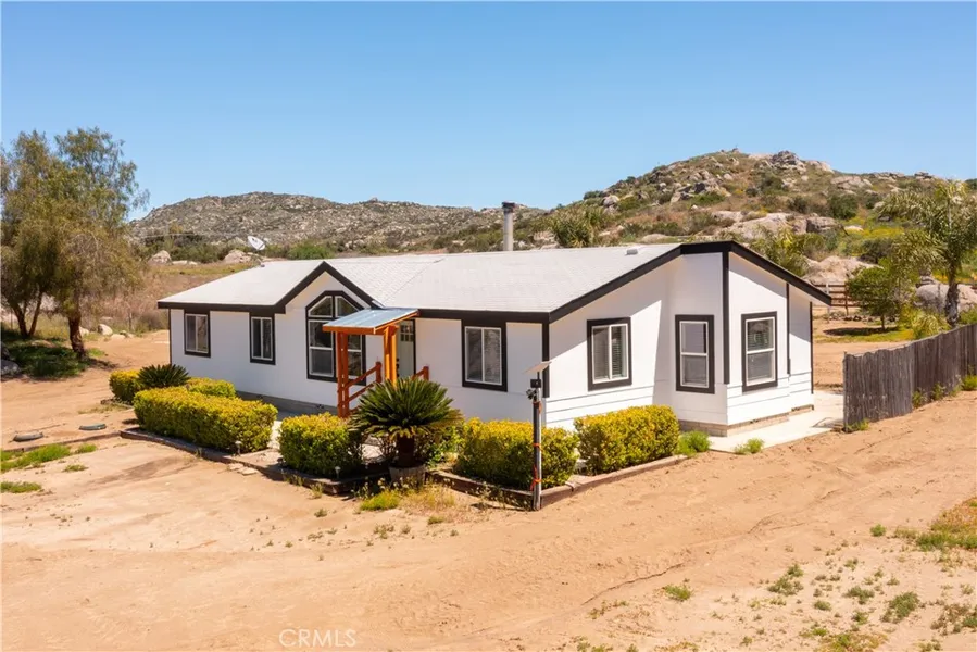 Beautiutiful 3-bed, 2-bath manufactured home nestled on over an acre in Homeland, CA. Built in 2006, this home boasts an updated kitchen with elegant white cabinets and gold hardware, complemented by laminate wood flooring and modern baseboards. Freshly painted inside and out, with new light fixtures throughout. Enjoy tranquility in this quiet locale, perfect for accommodating your toys and animals.