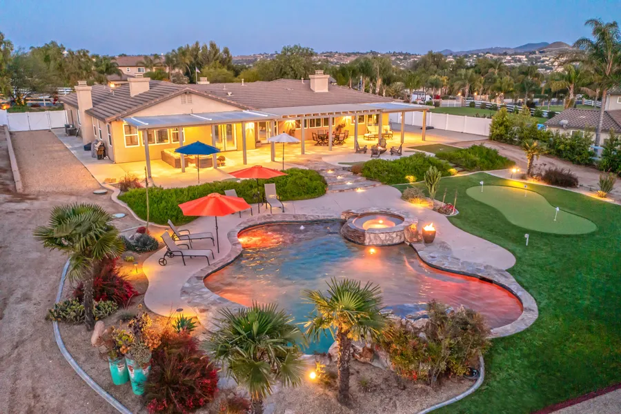 Welcome to this stunning single family pool home located in the serene canyon setting of Bridle Creek. This beautiful, completely fenced, property offers luxury and privacy! Amenities include: a stunning swimming pool with waterfall, spa and wadding area, putting green with artificial turf that has sprinklers to cool it in the summer, RV parking and dump, two - two car garages, an Aluma-wood patio cover with ceiling fans that runs the length of the home, front courtyard with fireplace (adjacent to the multi-generation suite), waterwise landscaping, dog run, storage shed, assorted fruit trees, and plumbing for future outdoor grilling facilities. Step inside to discover a home designed for both relaxation and entertainment. The open floorplan seamlessly connects the kitchen, which includes: a walk-in pantry, stainless steel appliances, breakfast counter, and nook, to the family room with b...