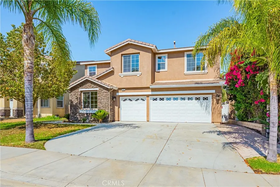 Beautiful **5 Bedroom**3833 sq. ft. Home with Wide Open Floorplan!!**3 Car Garage** Double Door Entry leads you into the spacious Formal Living Room/Dining Room areas with High Ceilings, and Beautiful **Flooring which is Stone Polymer Composition Luxury Vinyl** throughout!! Also downstairs is a Large Room with Double Door Entry that can be used as an Office/Den. Next will be the Wide Open Great Room with Fireplace. Enjoy your beautiful kitchen with Large Island with Bar Seating, Granite Countertops and New Stainless Steel Appliances. New Appliances include Refrigerator, Dishwasher, and Double Oven. Behind the Family Room is a Large Bedroom and Full Bathroom. Continuing Upstairs you can step up to an Enormous Bonus Loft with a fireplace and another Large Room behind it that can be used as a Playroom or whatever you need. Large Primary Bedroom with Double Door Entry, plenty of windows and ceiling fans. Continue to the Primary **En Suite Bathroom** which features His and Her Vanities, Separate Walk-in Shower, Oval Tub and Large His and Her's Walk-In Closets. There are 3 Additional Large Bedrooms, a Full Bathroom in the hallway and Large Laundry Room Upstairs. Laundry Room includes cupboards and sinks. Additional Features include: covered Concrete Patio, beautiful park like backyard with a **Water Fall** and hardscape and enough room for a pool! Large Side areas with vinyl fencing all around. Close to the 215 freeway, Close to schools, Audie Murphy Sports Park or Enjoy the Community Park with Playground. Come see it before it's too late!!
