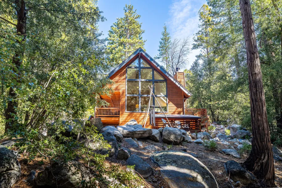 "Heaven's Window Chalet", A stunning mountain retreat designed to impress with its breathtaking two- story, floor-to-ceiling windows that flood the great room with natural light. Nestled in the sought-after Fern Valley neighborhood, this exceptional home sits on a picturesque wooded lot along a seasonal creek, surrounded by towering trees, striking granite boulders, and offering distant views of dramatic Lily Rock, an Idyllwild landmark. Every detail of this home reflects comfort and convenience, from the newly installed generator to the efficient mini-split heating and air-conditioning units. Thoughtfully designed, the main level features 2 bedrooms, 1.5 baths, a spacious great room, and a laundry area. French doors open to both the front and rear decks, seamlessly blending indoor and outdoor living. A charming spiral staircase leads to the private primary suite, complete with walk-in storage closets and two inviting loft spaces. Perfect for entertaining, the expansive covered front porch provides an ideal setting to gather with friends and family, while the peaceful rear deck offers serene creekside views. Unwind under the stars in the large hot tub, a luxurious bonus for mountain living. Additional storage is plentiful with two large outdoor sheds. Set among some of Idyllwild's most beautiful custom homes with sensational views, Heavens Window Chalet is a true mountain sanctuary offering both modern amenities and timeless charm. Come experience Idyllwild, home of Adventure, Art, Harmony & Music!