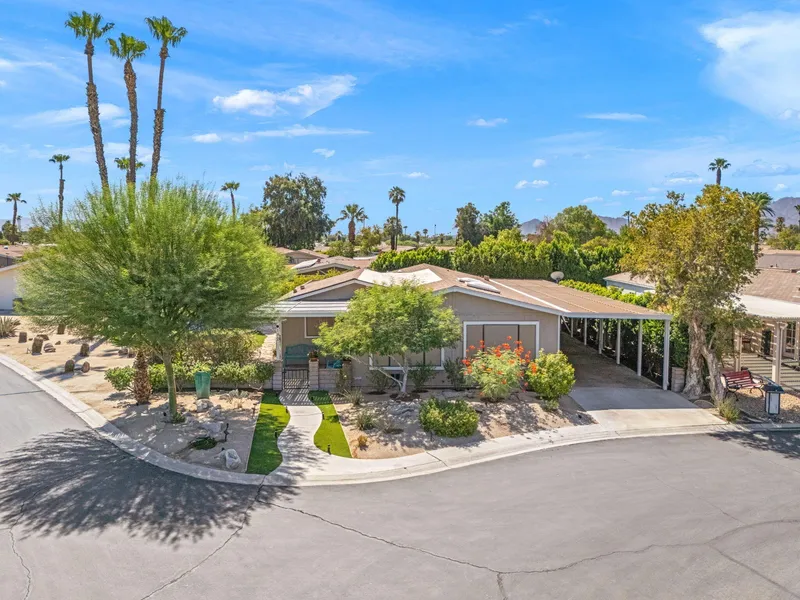 Charming Home with Private Yard in Suncrest Country Club. Known in the community for its beautiful landscaping and curb appeal, this charming 2-bedroom, 2-bath home is a rare find. Sitting atop a spacious corner lot with a generous side yard, it has more privacy than most manufactured properties. Inside this lovely home, you'll find an open layout with a freshly painted interior, a well-appointed kitchen, including a professional-grade Wolf stove-top, a renovated primary bathroom, and an office that overlooks the garden patio. A separate laundry room includes new cabinetry for added storage. Outside, the backyard is your private oasis with flagstone pavers, an olive tree, and colorful Texas Ranger hedges. There is ample space for covered patio dining, sunning, gardening, or simply enjoying a colorful sunset on the front patio. This well maintained home has newly added west-facing solar screens and a new UV air filtration system for cleaner indoor air. Suncrest Country Club is a 55+ community and offers resort-style amenities: multiple pools and spas, a 9-hole regulation golf course (separate), tennis & pickle ball courts, and a clubhouse with bar, restaurant, pool table, and seasonal social activities. Located a short distance to El Paseo shopping and dining, The McCallum Theater, The Living Desert, and much more. Buyer must be approved by Suncrest CC. New land lease will be $999 per month. There is no HOA.