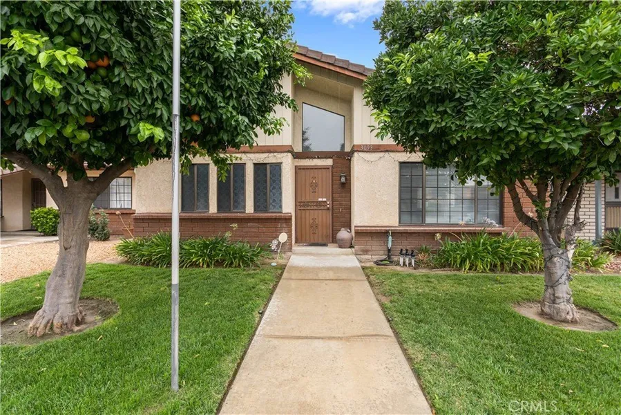 The landscaped front yard showcases a lush, l...