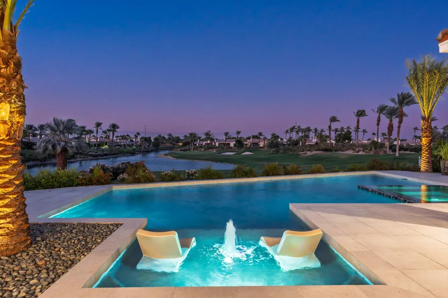 Elevated above the 14th green at Andalusia Country Club, this exceptional residence captures dramatic views of the shimmering lake and majestic mountain range - all with no neighbor to the left, creating rare openness and privacy. A charming courtyard with a stone water feature and arched brick entry sets the stage for the home's sophisticated elegance. Inside, the expansive great room is anchored by a striking linear fireplace with a floor-to-ceiling marble surround, soaring ceilings, and disappearing glass walls that frame the views and invite seamless indoor/outdoor living. Designer lighting, automated shades, and oversized porcelain tile floors enhance the refined yet comfortable ambiance. The gourmet kitchen is a masterpiece of style and function, with custom cabinetry, dramatic quartz countertops with a waterfall-edge island, and professional-grade Sub Zero and Wolf appliances, including a 48'' range, dual-zone wine refrigerator, built-in coffee system, and warming drawer. A custom-tiled bar with quartz surfaces adds a chic touch for entertaining. The luxurious primary suite is a serene retreat with a spa-inspired bath wrapped in quartz. Guest rooms are equally inviting with designer details, while the powder room is a true showpiece with a floating quartz vanity, petrified wood vessel sink, and Italian marble accents. Outdoors, a spectacular negative-edge spa, EVO cooking center, integrated patio heaters, solar shades, and outdoor-rated TV create the ultimate year-round living environment. Additional highlights include a Control4 smart home and theater system, owned solar with battery backup, and a fully finished three-car garage with epoxy flooring. A residence of remarkable beauty, thoughtful upgrades, and panoramic views. Come live the life you've always imagined!