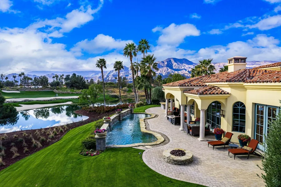 Incredible custom home located behind the private gates of The Hideaway! This 6388 square foot home sits on a cul-de-sac and offers great space for family & friends! Courtyard entry takes you to one of two pools on the property with direct access to the guesthouse with sitting room, kitchenette, walk in closet, bedroom, and bath. These is also a courtyard staircase that leads to the second casita with large bedroom and private bath and balcony! Step into the iron and glass double doors that lead to the formal entry and living area with fireplace, travertine flooring, with a backdrop of large windows. Large culinary kitchen with warm wood cabinetry, granite slab counters, 2 islands both with sinks, stainless appliances. The dining area and family room is just off the kitchen with fireplace, wet bar and walk in wine vault to make for great entertaining! Large primary suite with hardwood flooring, sitting area with fireplace, stunning custom walk in closet, beautifully appointed primary bath with soaking tub, walk in shower, & double vanities. There is a private office with warm finishing including wood flooring, custom wood built-ins, and shutters. There is additional space in the main house that is being used as a media room. The second pool is located in the back with paver patio, flowing water features, built in BBQ island, fire pit, and plenty of room for dining or lounging in the sun! Take in the stunning panoramic views of the fairway, lake, and mountains this home has to offer! There is a long paver driveway leading to the 2 car garage with an additional golf cart garage! *NOTE: Home is set up as a 3 bedroom, office, and media room/study but can be a 5 bedroom home as each room has its own bathroom, closet,& doors that open up to the outside.