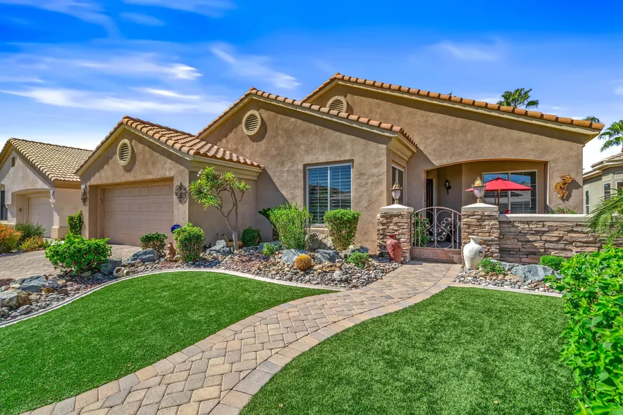 SPECTACULAR VIEWS from this 2407 sq. ft. 2 bed, 2 bath PLUS DEN home in Heritage Palms C. C. Featuring beautiful brick paver driveway AND extended paver front and rear patios, artificial turf, desert style landscaping, entry courtyard and leaded glass front door. This spacious OPEN DESIGN has plenty of room for your large dining parties, casual bar with sitting area to entertain guests and family room off of the beautiful island design kitchen with new stainless appliances. Additional upgrades include recently replaced dual A/C units, garage A/C, plantation shutters, French patio doors and electric sun shades across the entire extended rear patio that has dramatic views of the 14th and 15th fairways, lake w/fountain and panoramic VIEWS of the mountains. The large primary suite has dual vanities, separate tub & shower and a large walk-in closet. This unique layout also includes an oversiz...